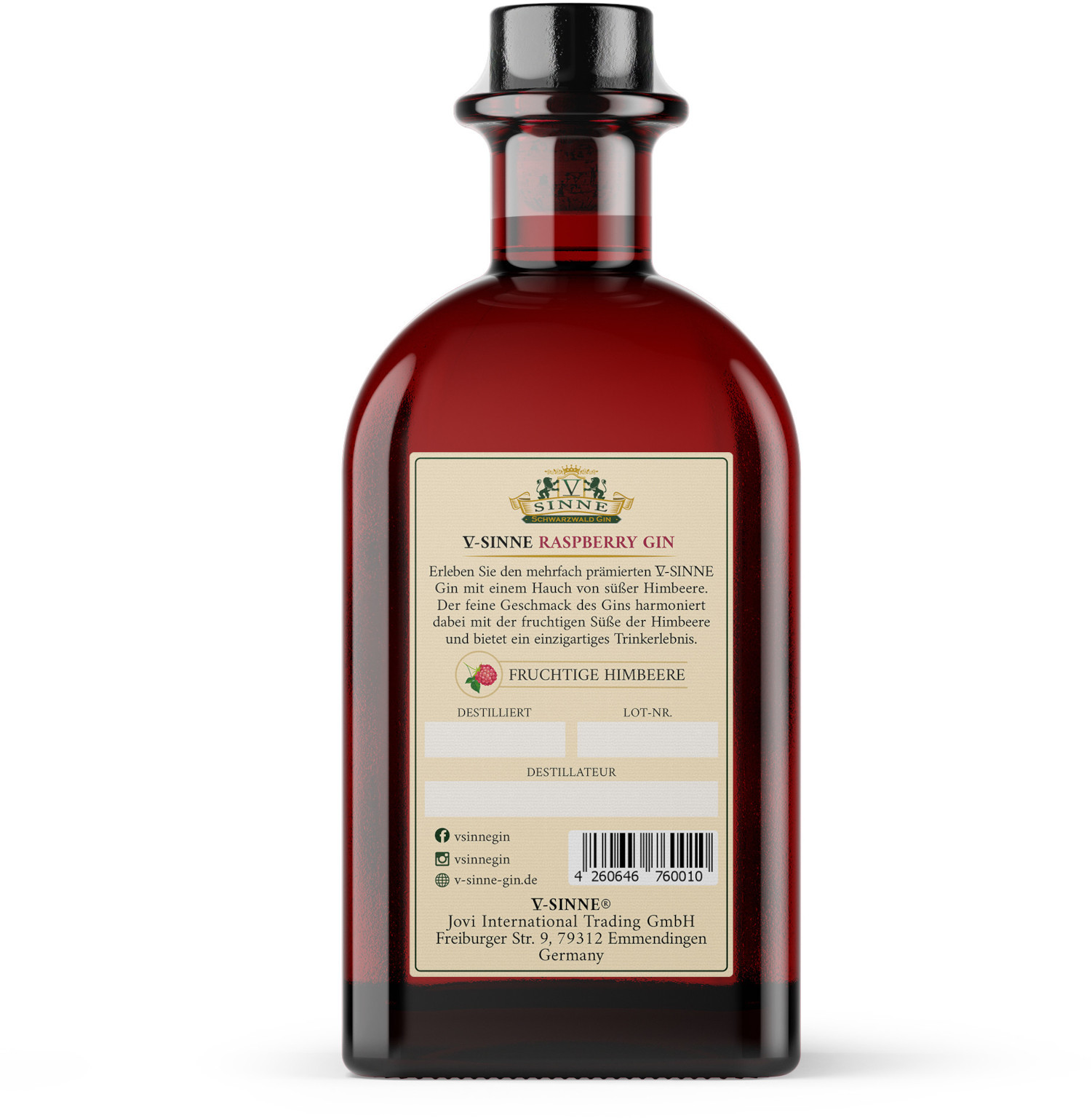 The loving production of V-Sinne Raspberry Gin is clearly evident in its taste. For example, only clear spring water is used in its production. It is also distilled a full three times to elicit its fine aroma. V-Sinne Raspberry Magic Gin is made exclusively from natural ingredients and is completely free of artificial additives.