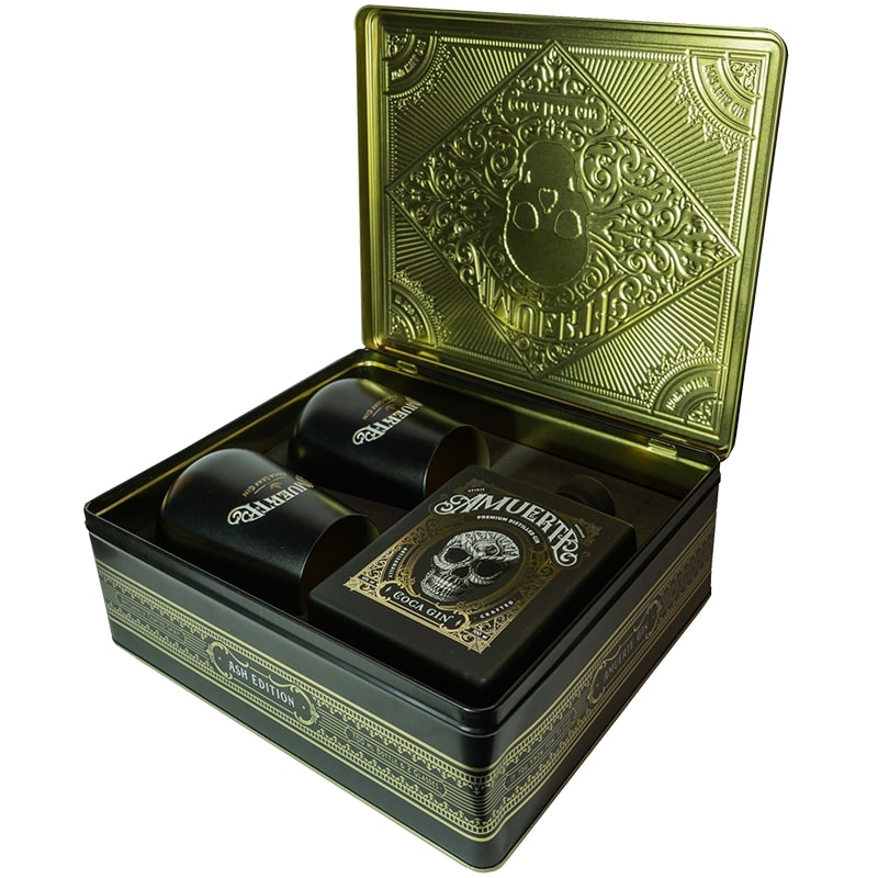 Dans cet attrayant coffret Amuerte, vous trouverez le gin Amuerte Coca Leaf, ainsi que deux verres assortis dans une boîte-cadeau à tête de mort en métal noir. Avec cette boîte, vous ferez des joyeux, car, avec de jolis verres, on profite encore plus de ce gin unique. La boîte à gin Amuerte Coca Leaf avec 2 verres est donc le cadeau idéal pour les vrais amateurs de gin.