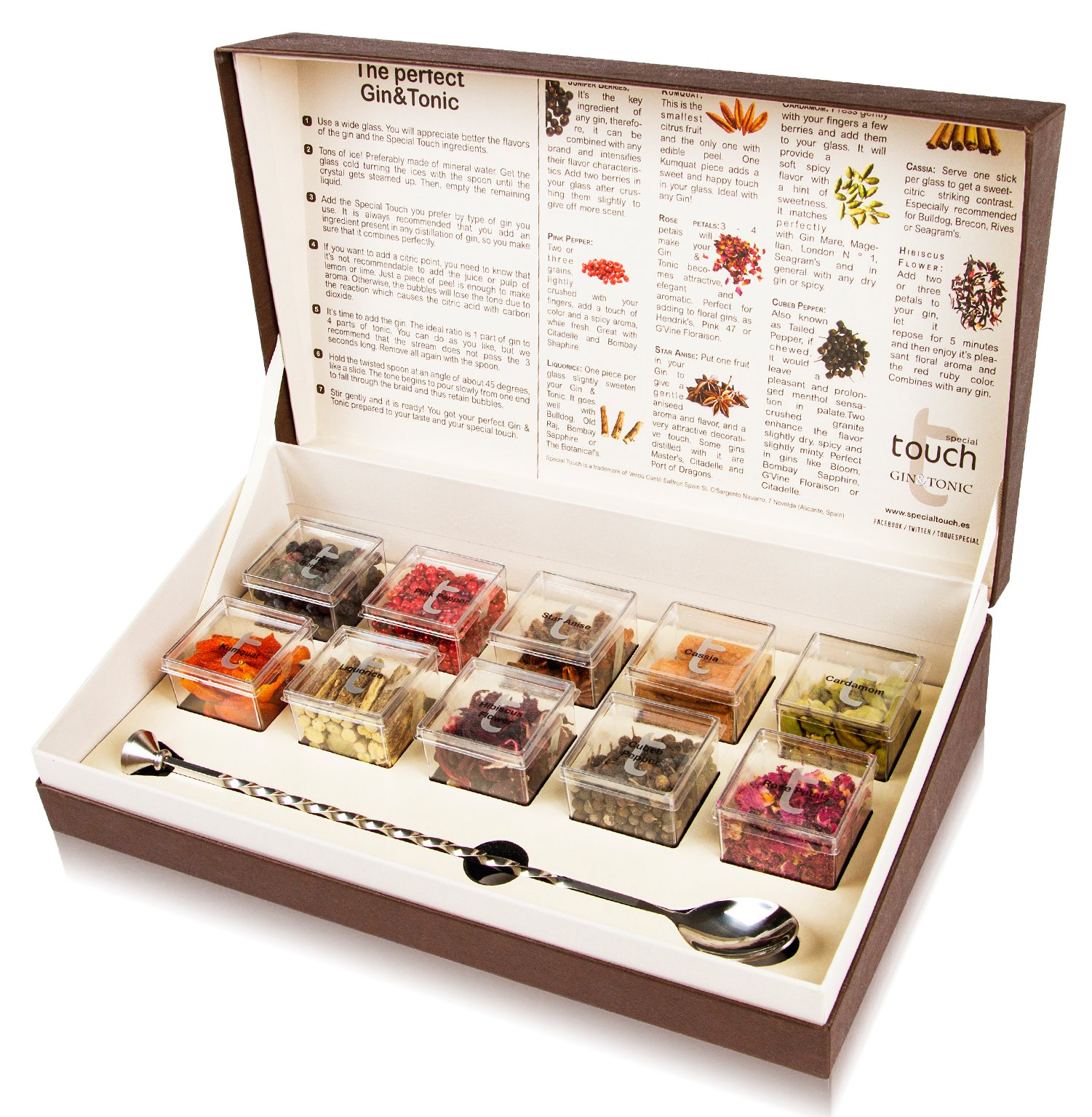 Dieses hochwertige Set ist in erster Linie zum Garnieren von Gin & Tonics geeignet und beinhaltet neben einem geflochtenen Rührlöffel zehn Botanicals - unter anderem Wacholderbeeren, Rosa Pfeffer, Kubeben-Pfeffer, Kardamom, Hibiskusblüten und Sternanis. Es kommt in einer edel aufgemachten Holzbox daher.